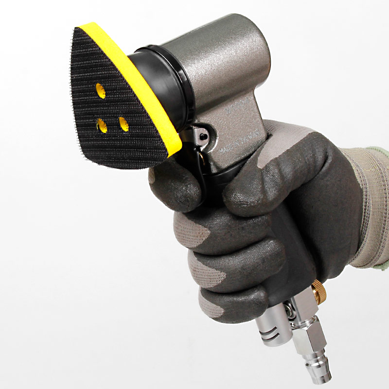 1.帶偏心式,裝砂紙打磨出來(lái)的效果是“霧”狀,帶細(xì)小亂絲的小紋路,適合后工藝需要做噴砂、烤漆,增加附著力。(標(biāo)配一般為3mm偏擺,可選配1.5mm,0.75mm偏擺度)